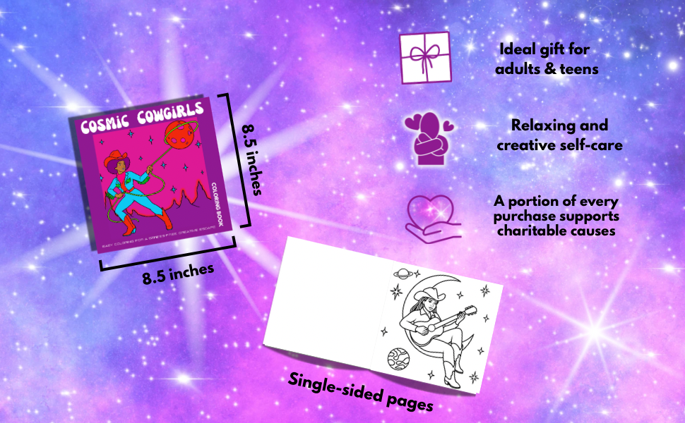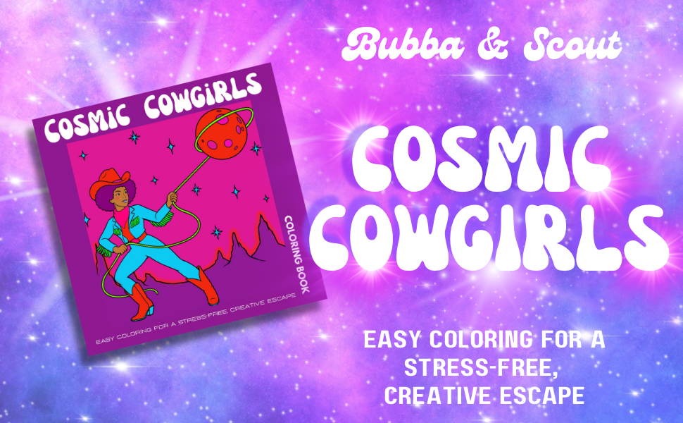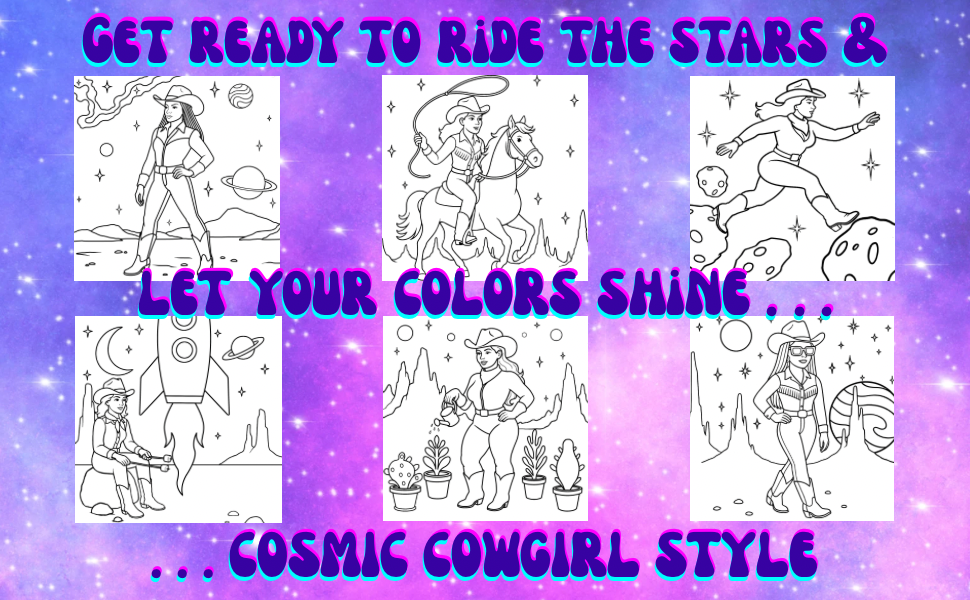 Cowgirl spirit meets cosmic magic. Find flow with 25 simplified, bold-outline illustrations: moonlit canyons, comet rides, and starry trails—made for relaxing color time without tiny details. A relaxing coloring escape for dreamers of all ages.